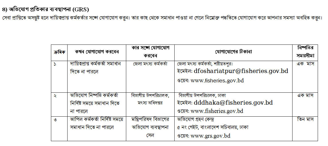 অভিযোগ নিষ্পত্তিকারী কর্মকর্তা: উপজেলা মৎস্য কর্মকর্তা, ডামুড্যা, শরীয়তপুর।